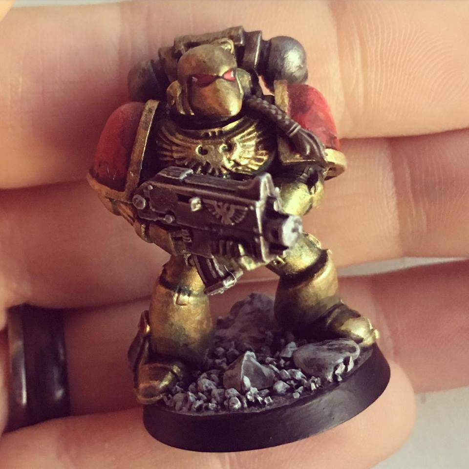 I chose a Space Marine because it seemed something really simple to start with. The plastic material is easy to cut out and clean up, the armor ensures that blocking color and shading will be easy. I did a lot of research online to see what I wanted to paint her like and came across this blog post. I like how the gold and red works together. and I like the blue coming in from behind the emblem on the chest. Unfortunately the turquoise on my mini ended up almost disappearing completely. To the left is an image that I used for inspiration for my own.