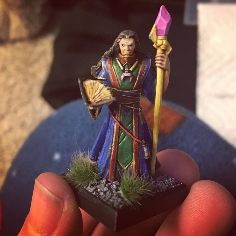 Lots of things happened in this next picture and looks like I did not get any in between shots. I finished the staff colour and tidied up the gold as much as I could. I also cleaned up the book and finished the detail on his necklace and things hanging from his garment. On his robes I did an all over delicate black wash to give it more depth. I did a sepia wash on the staff and book. I also added a skin tone which I also sepia washed and dry brushed with an even lighter skin colour to highlight. This was the first time I started to have faith that this mini wasn’t going to be the worst. However, I haven’t even gotten to the eyes yet.