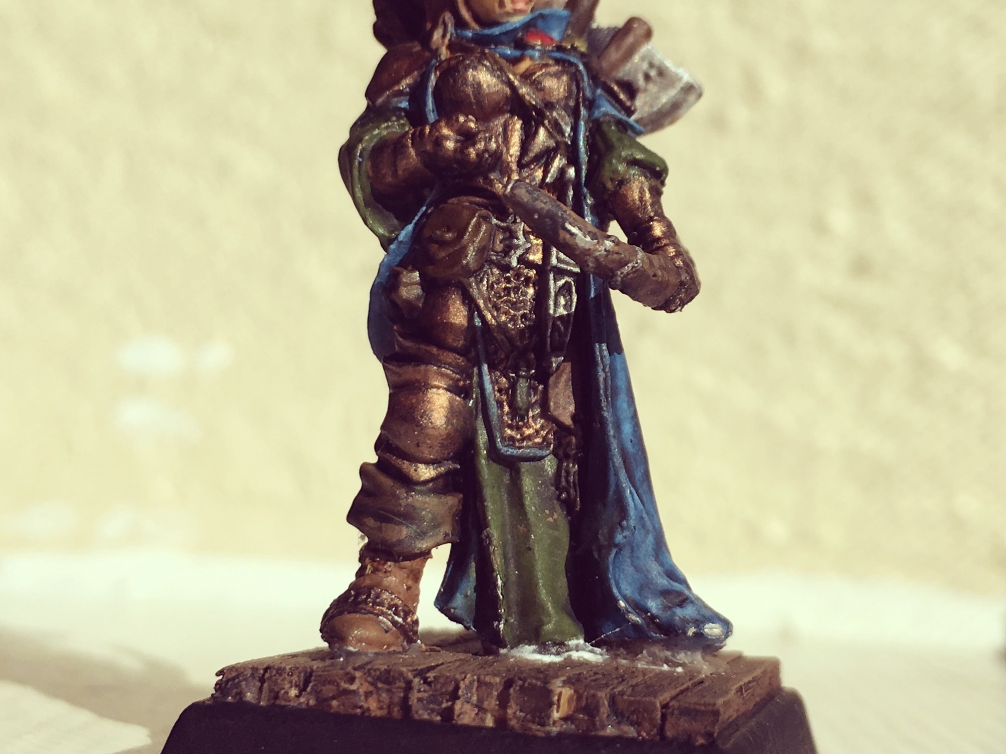 This part, the washing and highlighting is usually where the final mini comes together for me. That was not the case here. I think the copper and green came out quite well. But I think the wash on the hat and cloak could be better. I struggle sometimes with washes to make them to “clean” but instead it often looks a little messy or dirty. I dont think it is bad at all, but I think it could be better and it is something to take notice of and work on for the future.