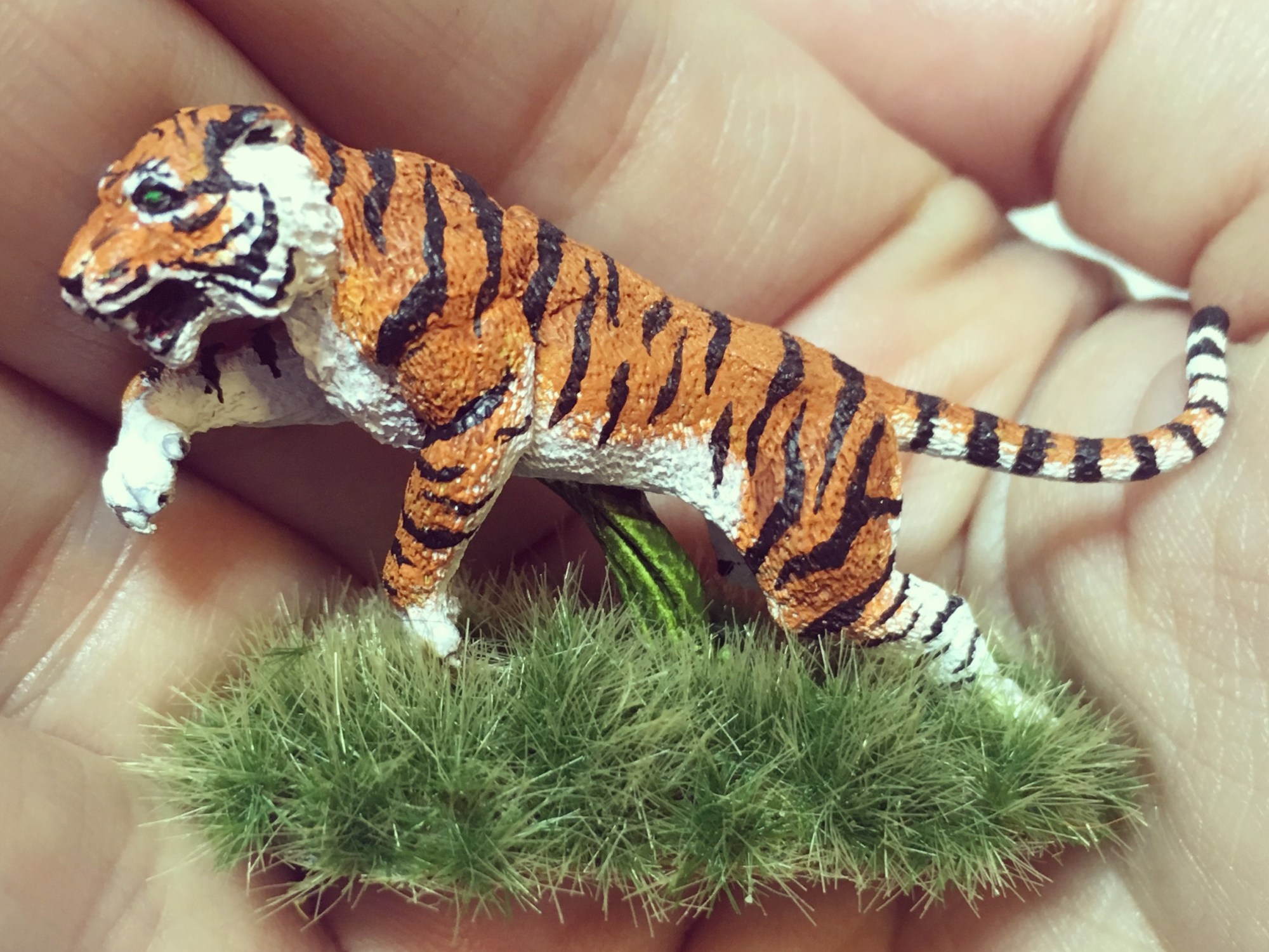 Lastly I added a punch of bushy grass to the base. I did this so that the weird tall stem going to the tigers mid would be covered and so that it would look like the tiger was pouncing out from the grass.
