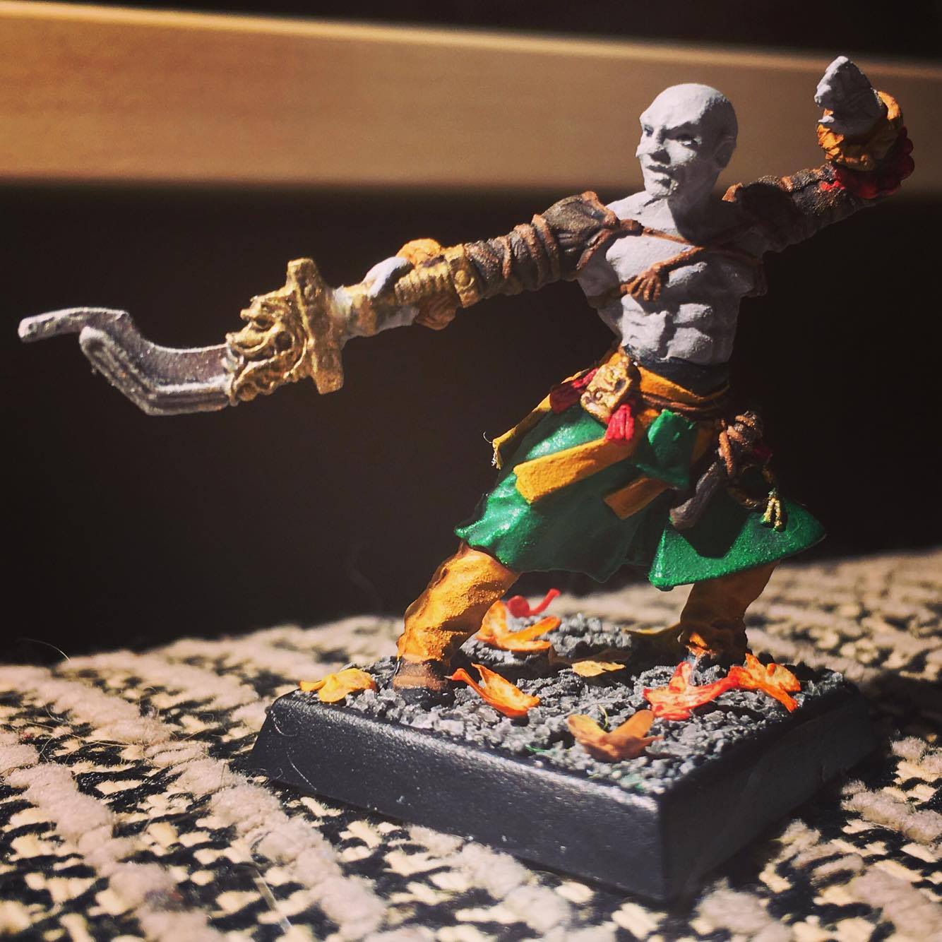 I promised a friend that I would paint him a mini, but he doesn’t play role playing games or minis games at all, so it was to be more decorative or just humorous. He is super into Dragon Ball and said his favorite parts where the Androids. I looked at the minis I had and that we sell in the store I work at. The best combination that I could find was Android 14 and a Reaper mini for a monk. His dumb sword kept cracking off, I will be gluing it back on later after everything else it painted.