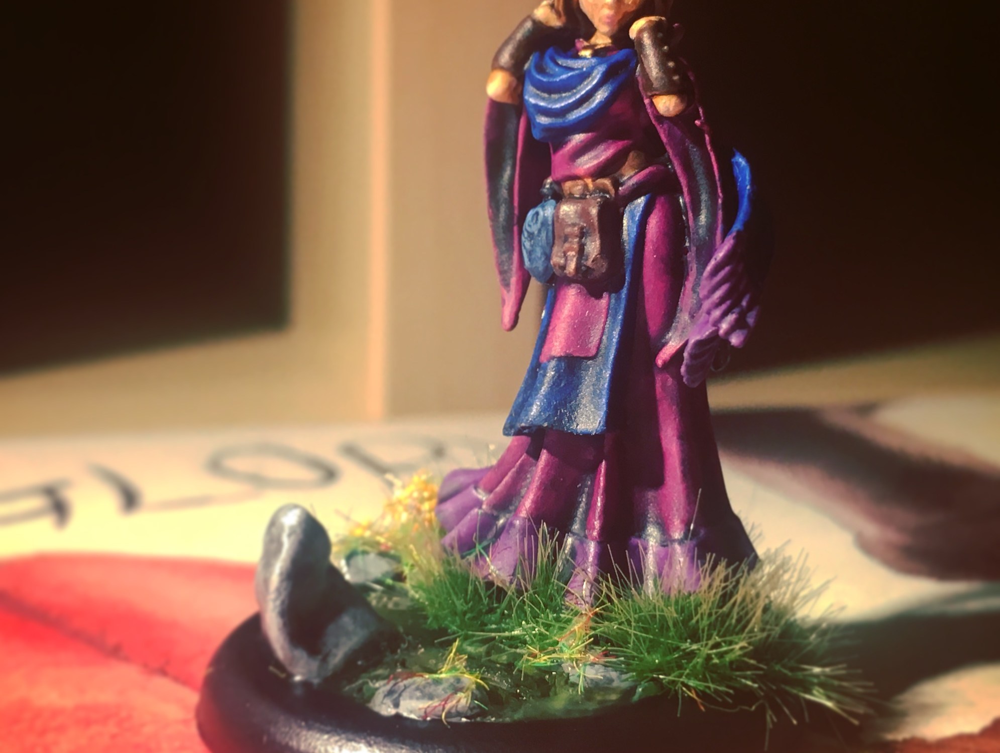 I have an amazing friend and I wanted to do a nice thing for her, so I offered to paint her a mini for her Pathfinder character. Here is the info I had on the character. Her name is Samaidriel, she’s an Elven Exalted of Desna (essentially a glorified cleric). Light brunette, with green eyes. Her weapons are daggers and a starknife. She’s very feminine, wearing deep pink robes under her chain shirt which has Desna’s holy symbol on the back (a blueish purple butterfly). Her colours are pinks, purples, and midnight blue are her goddess’s colors.