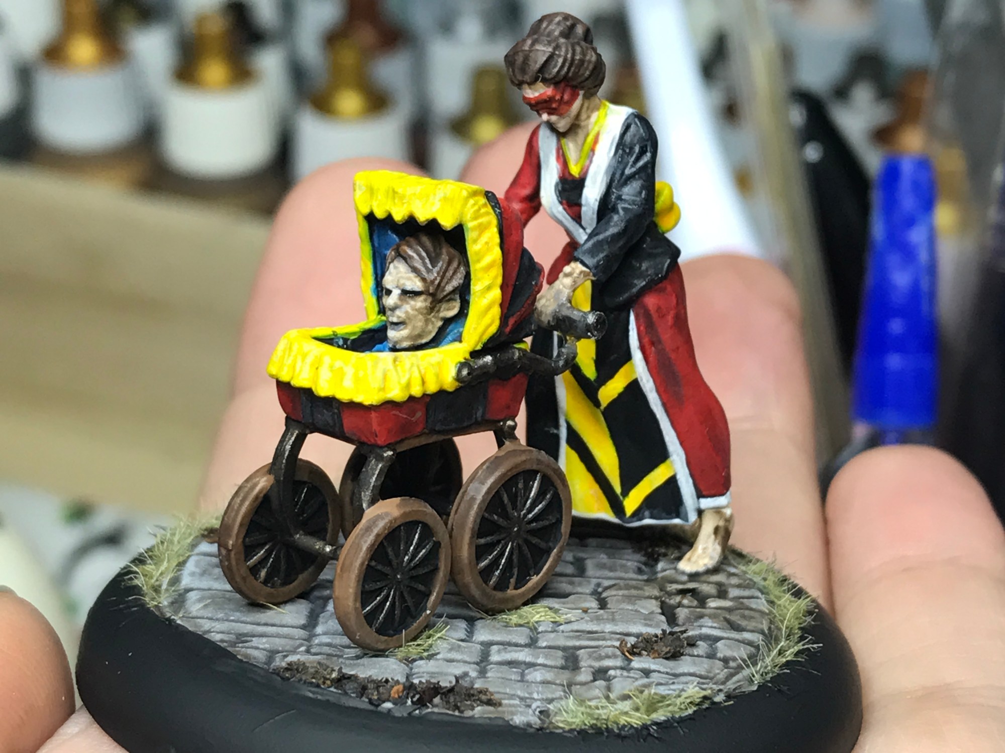 This is Philip and the Nanny, Philips head is in the buggy. Since the Queen of Hearts says “Off with their heads” I thought this would be a fitting mini to represent her. Since the mini has a lot of black I decided to prime her in black.