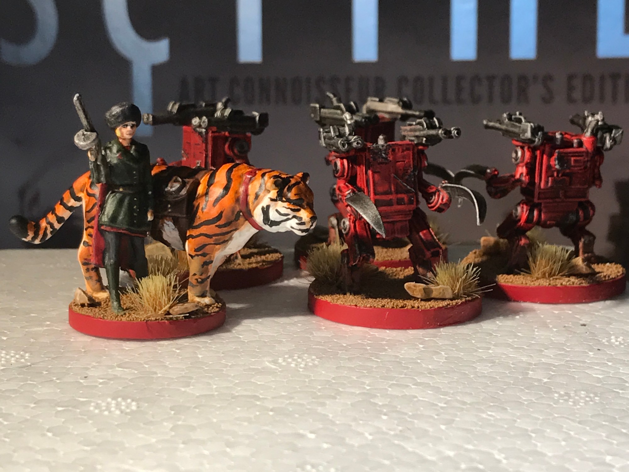 You can see the figure and the tiger. I will be honest, as beautiful as this board game is, the sculpts are really bad. You cant really tell for the mechs since they are not super detailed, but you can on the animals and people. The animals don’t have fur texture and the people are not defined especially in the face area which made painting them incredibly difficult.